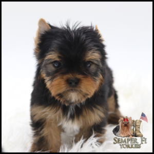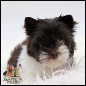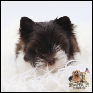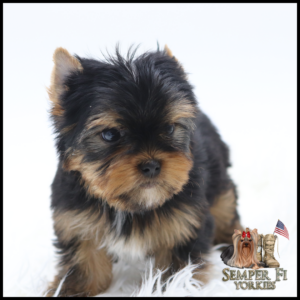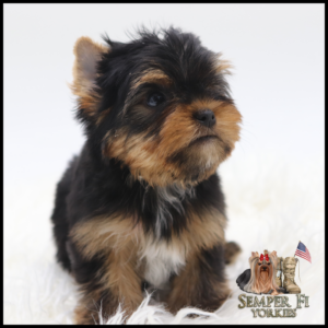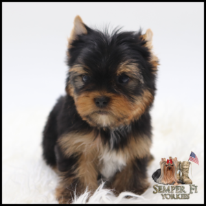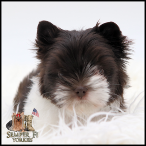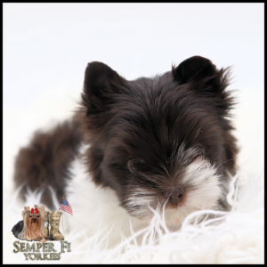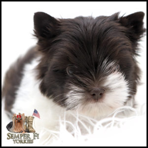 Vigil is an absolutely BEAUTIFUL traditional boy that is already so sweet like his daddy. He has beautiful coloring and I fully expect him to look like his daddy. His gold is such a rich caramel color right now that I’m almost positive that it will stay the dark gold that is so desirable in yorkies. With his big, wideset eyes and short muzzle, he is going to be nothing shy of stunning! Vigil has been reduced for faster placement.