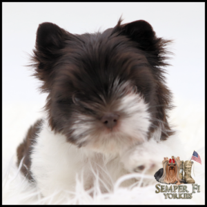Uno is a DARK chocolate parti male that is looking for his forever home. He is so dark and beautiful that I wish I needed another boy! He is the only puppy in this litter though I’ve put the two litters together so he has playmates. He’s got short little legs, and big wideset eyes with that small muzzle I’m positive he will be as beautiful as his mother when he is full grown. I also love the mismatched white on his face, it makes him look striking and unique. He is the sweetest, cuddly baby! He just wants to be loved on and will make a perfect lap baby.