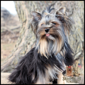 Pende is a beautiful traditional girl with an amazing coat and big, expressive eyes. Like almost all of our dogs, she was born here and comes from our breeding. In fact, all but three of our dogs are from our lines — a testament to my belief in the quality of my dogs and my breeding. She comes from Opha Mae and Blade. She was health tested and carries parti and chocolate, so we’re thrilled by that! She has such a sweet personality, just like her mama, so we expect her future puppies will have the same amazing personality.